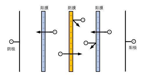 分為電滲析陰膜和電滲析陽膜兩種,陰膜具有透過陰離子而阻擋陽離子的特性,陽膜具有透過陽離子而阻擋陰離子的特性。將陰膜和陽膜交替排布,在直流電場的作用下,可實(shí)現(xiàn)鹽分的遷移,從而實(shí)現(xiàn)鹽分的脫除或濃縮。