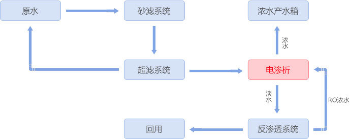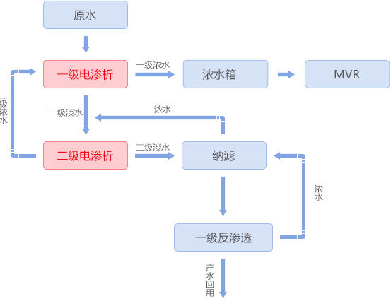 稀土氧化物催化劑生產(chǎn)過程中會產(chǎn)生大量3-5%硝酸鈉廢水,采用均相膜電滲析裝置將硝酸鈉濃縮到20%以上進(jìn)入蒸發(fā)系統(tǒng),淡水經(jīng)反滲透處理后回用。該均相膜電滲析產(chǎn)品解決了異相膜和部分進(jìn)口均相膜濃縮倍數(shù)不高、不耐金屬離子污染的問題,同時(shí)實(shí)現(xiàn)含硝酸鈉廢水零排放及資源化利用。