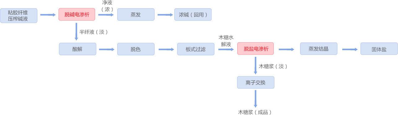 粘膠纖維生產(chǎn)過程中產(chǎn)生大量壓榨廢堿液,以前轉(zhuǎn)移到污水處理廠用酸中和,不僅產(chǎn)生大量固廢,而且造成資源浪費(fèi)。采用均相膜電滲析裝置,壓榨堿液經(jīng)電滲析脫堿回用,脫堿后的半纖經(jīng)酸解、電滲析脫鹽凈化后生產(chǎn)木糖,該工藝是工業(yè)廢棄物資源化利用并實(shí)現(xiàn)廢水零排放的典型案例。該項(xiàng)目已連續(xù)運(yùn)行兩年,全年可實(shí)現(xiàn)20萬噸高含量半纖維素堿法漿處理回用,對傳統(tǒng)產(chǎn)業(yè)工藝綠色化改造具有重要意義。